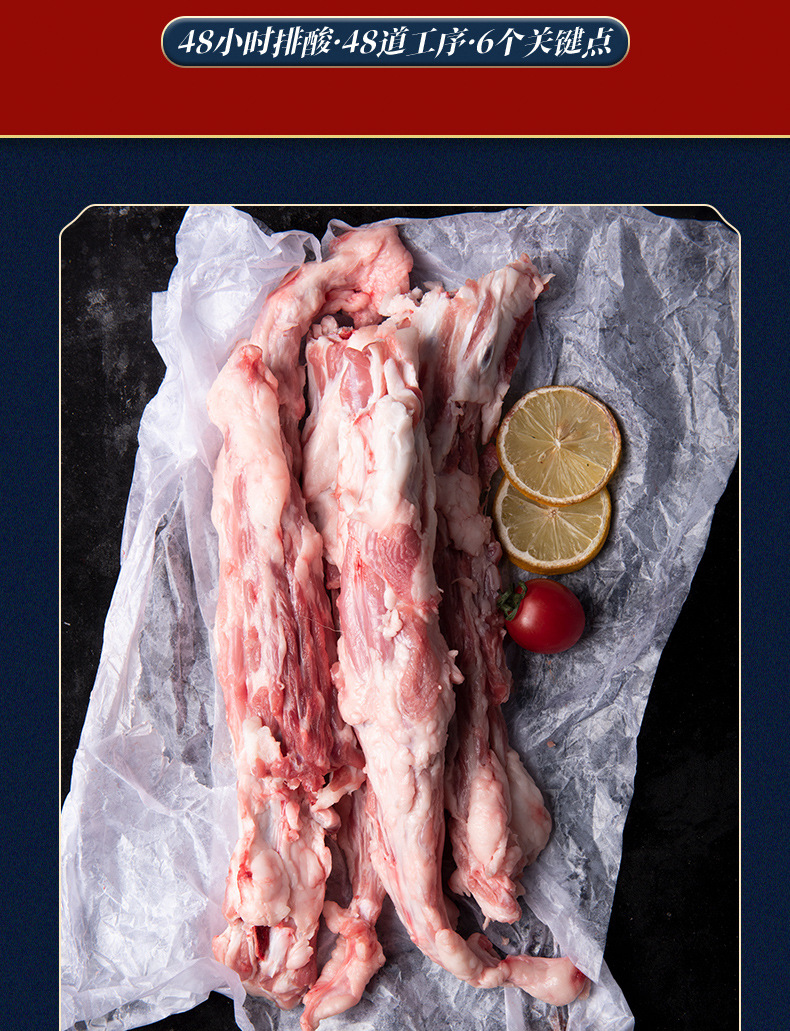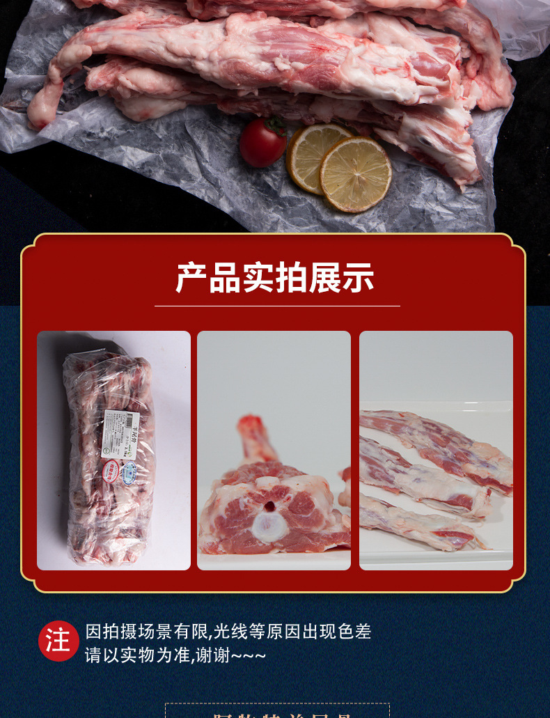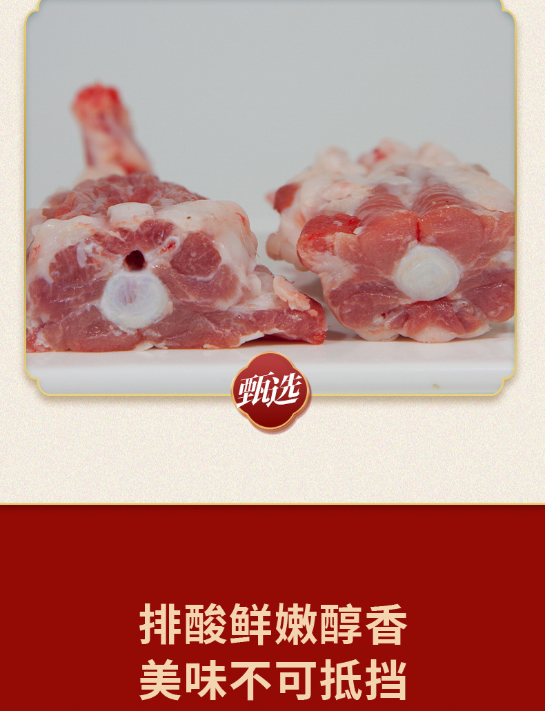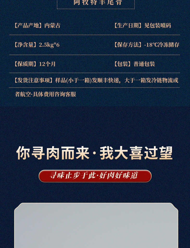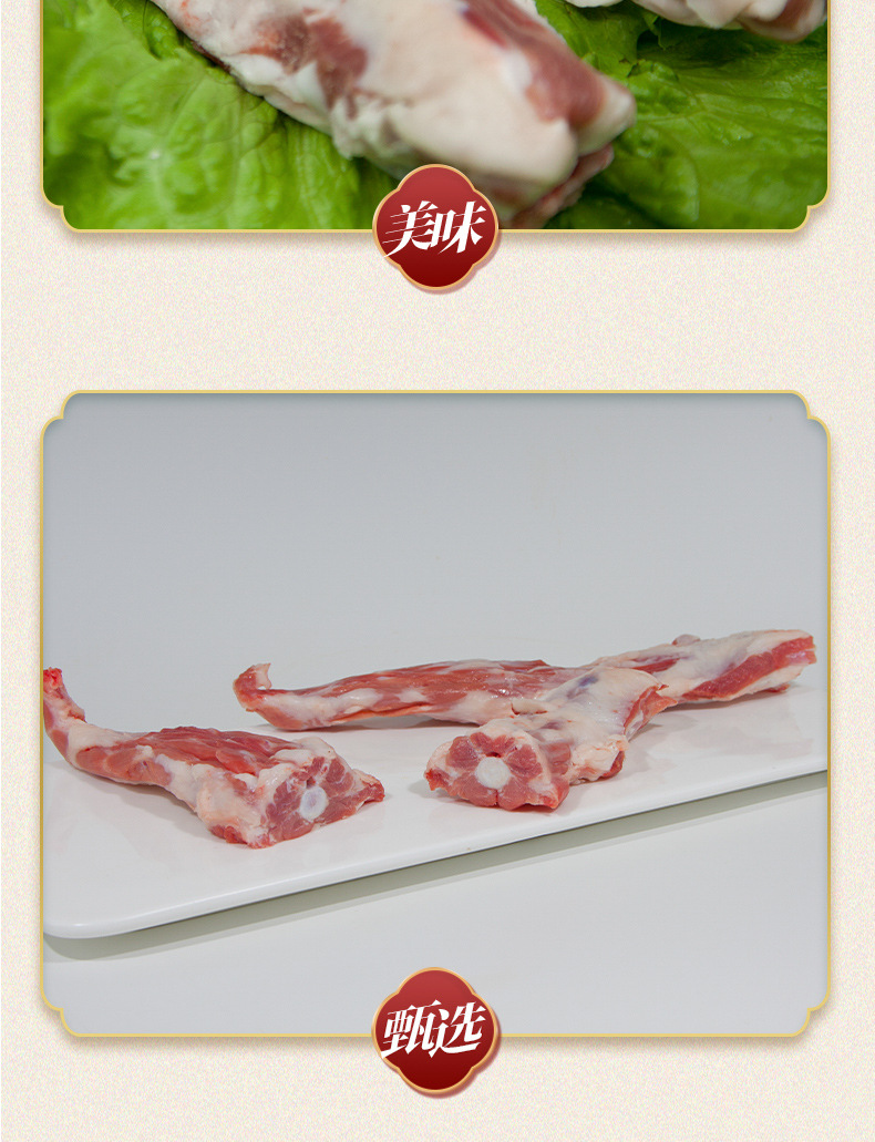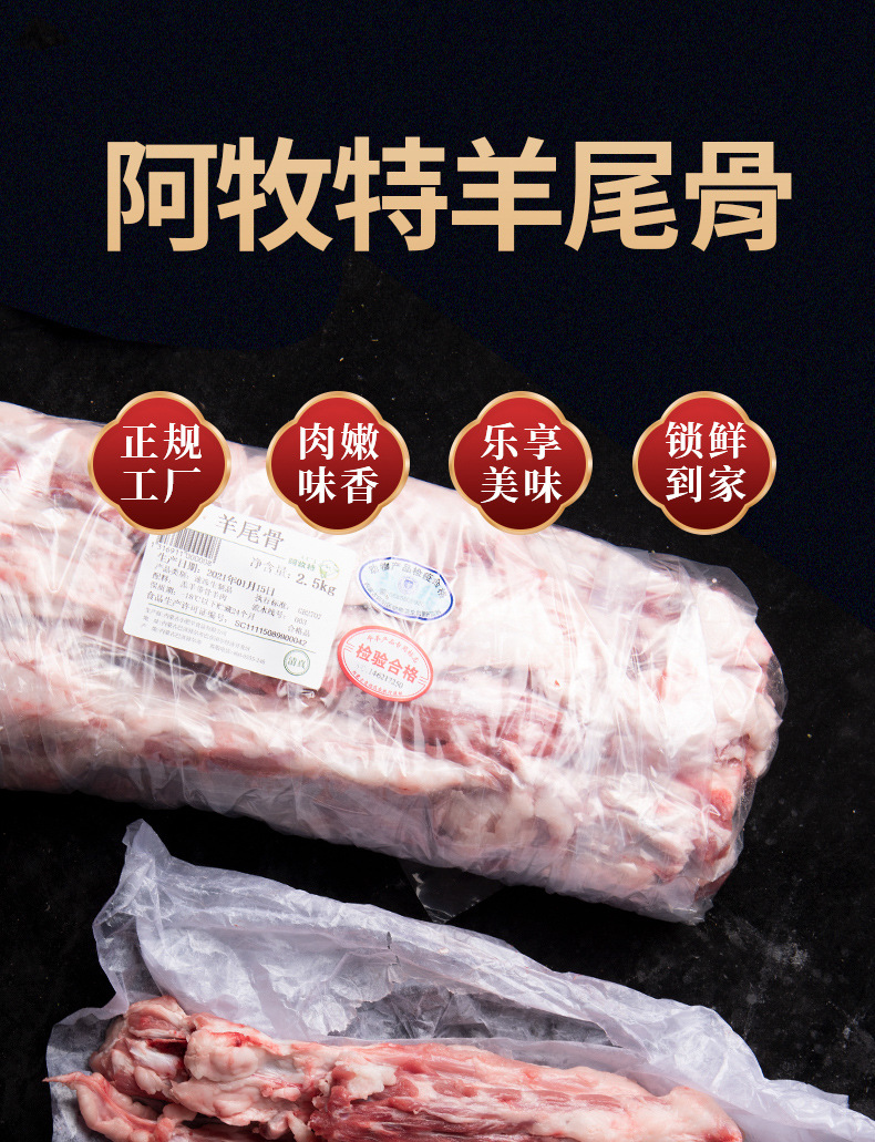 配料:帶有少量脂肪,尾尖向內(nèi)整齊碼放,塑白膜包裹。羊尾精細(xì)分割,骨肉均勻,肥瘦相間,富含膠質(zhì)。
