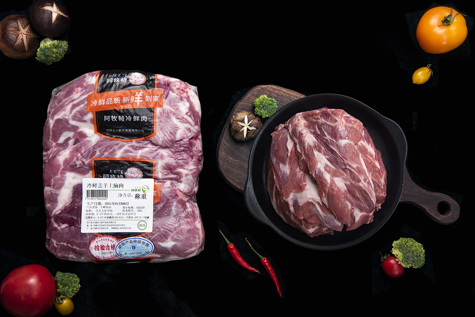 配料:取自第一塊肋骨前羊脖部具有特色花紋的肉塊,原切整塊上腦肉。“上腦”位于脖頸后、脊骨兩側(cè)、肋條前,因接近頭部故稱上腦。肉質(zhì)鮮嫩多汁,口感綿軟,入口即化,脂肪低而蛋白質(zhì)含量高。